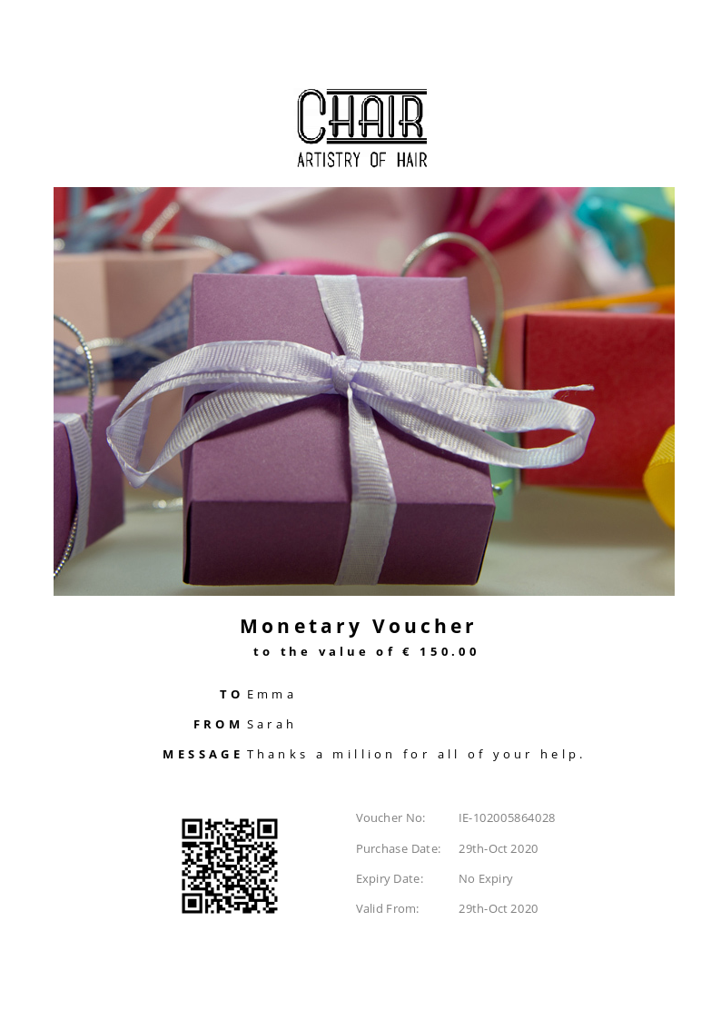 Chair Artistry of Hair allows you to purchase instantly printable gift vouchers, special offers and tickets using the Voucher Connect platform.